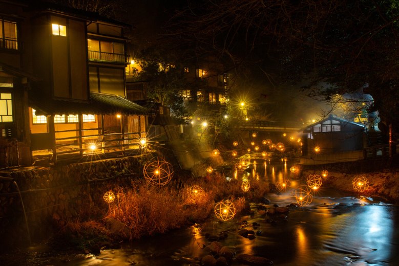 One of the best times to visit the town is during the Yu Akari Illumination festival, which takes place from late December through late March (with some seasonal variability). The Kurokawa Onsen Yu Akari illumination is an annual festival in which locally crafted bamboo lanterns adorn the town and river, adding to the town’s magical appearance. The illumination occurs from nightfall through to 10 pm daily during the illumination period.