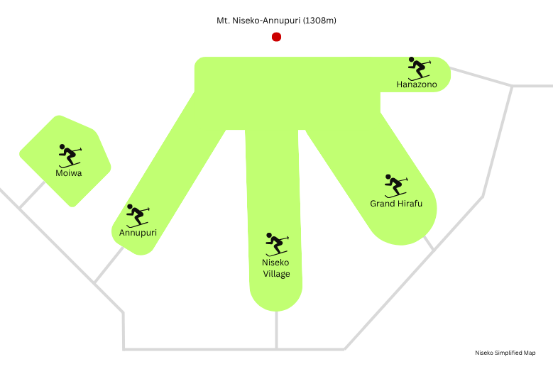Grand Hirafu, Nisoko Village, and Annupuri are the largest of the ski resorts, which cover most of the southeastern half of Mt. Niseko-Annupuri, with Grand Hirafu being the most popular. The three resorts are all joined together at the top of the mountain, enabling guests to ski between the resorts. Shuttle buses connect the three ski resorts at the base of the mountain as well.  Hanazoro is a smaller satillite of Grand Hirafu Resort, and is a quieter alternative to Grand Hirafu. All four of these resorts are covered by the Niseko All Mountain Pass. Moiwa Ski Resort stands independent from the rest of the resorts, and is not included in the Niseko All Mountain Pass.